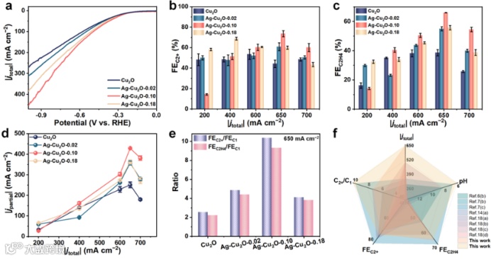 最佳的Ag-Cu2O-0.10催化剂展现出优异的C2+和C2H4的选择性,其在650 mA cm−2下FEC2H4达到66.0%,相应的部分电流密度高达429.1 mA cm−2。对比已报道的催化剂,Ag-Cu2O-0.10催化剂在FEC2+, FEC2H4, FEC2+/FEC1,和|jtotal|等方面均具有极大优势。