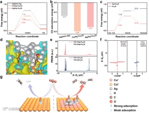 理论计算结果证实,Ag的引入降低*COOH生成的自由能,增加了Cu活性位点周围的CO覆盖率。此外,Ag/Cu2O界面还促进了C-C耦合,最终实现多碳选择性的提升。
