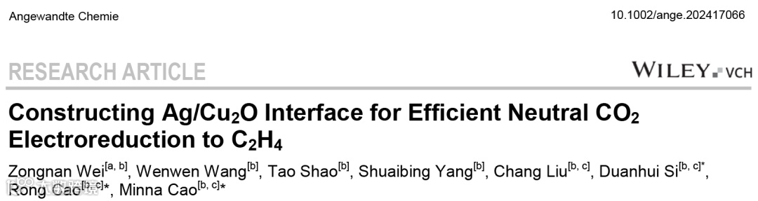Zongnan Wei, Wenwen Wang, Tao Shao, Shuaibing Yang, Chang Liu, Duanhui Si, Rong Cao, Minna Cao. Constructing Ag/Cu2O Interface for Efficient Neutral CO2Electroreduction to C2H4. Angew. Chem. Int. Ed. 2024, e202417066.
