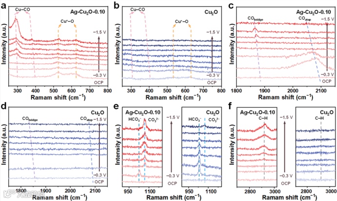 原位拉曼光谱表明,相较于Cu2O, Ag/Cu2O界面的构建能够在高电位下保留部分Cu+位点,改善活性位点周围的*CO覆盖率,并调节表面质子覆盖率。