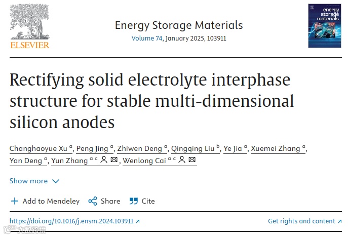 近日,来自四川大学的张云/蔡文龙教授课题组,在国际知名期刊Energy Storage Materials上发表题为“Rectifying solid electrolyte interphase structure for stable multi-dimensional silicon anodes ”的文章。该文章研究探索了无机和有机SEI组分的协同共存更有效地稳定了硅基负极界面,这将激发人们通过构建合适和稳定的界面来重新评估硅基负极的工作场景和设计原则。