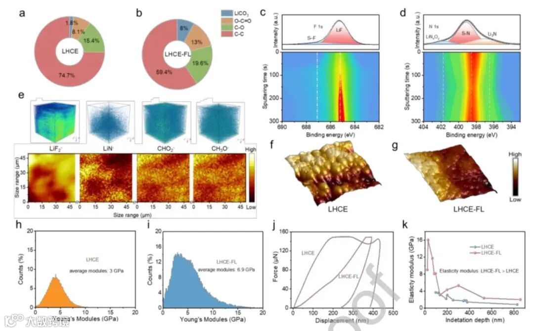 利用由FEC衍生出的低聚缓冲层(CHO2-/ CH3O-)作为混凝土,由LiFSI/LiNO3衍生出的无机支柱(LiF/Li3N)作为钢筋,形成有机-无机交联SEI的现浇混凝土结构。得益于SEI层的独特设计,兼具刚性和柔性。此外,刚性和柔性SEI有效地保持了Si颗粒的完整性,增强了其循环稳定性。