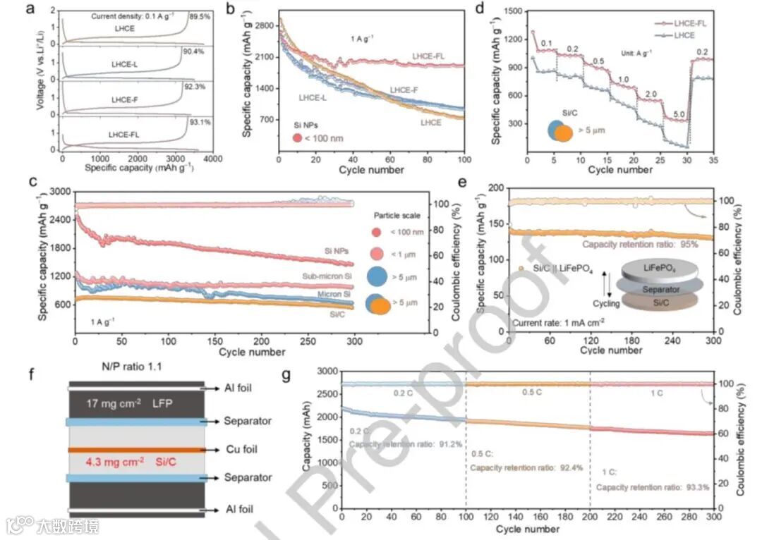 在300次循环后,Si/C || LiFePO4扣式全电池在1 mA cm−2下仍然提供超过95%的容量保持率。即使在高质量负载下,多尺寸硅基负极仍然可以显示出增强的容量保持。特别是,Si/C 负极显示出4.5 mAh cm-2面积容量,在100次循环后容量保持率为94%,同时,使用最佳LHCE-FL电解质的软包Si/C || LiFePO4电池在100个循环后以0.5 A的电流密度仍可以提供2.03 Ah的容量,这相当于91.2%的标称容量,这表明其具有实际应用潜力。这项工作为高能锂离子电池中合金型电极材料表面稳定SEI的原位构建提供了新的见解。