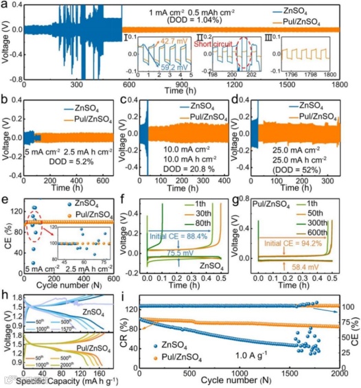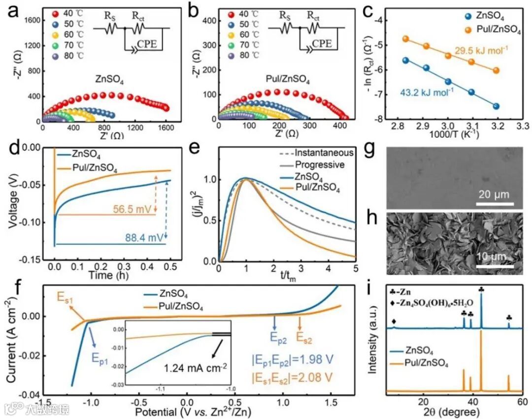 自适应吸附层在阴极/电解质界面对高热力学活性的水合氢和SO42-提供了持续的屏蔽效应,有效抑制了由副反应产物引起的次级反应。同时,Pul主链上密集分布着连续的锌亲和性末端,作为锌离子的宿主受体,促进锌离子在ZMAs表面附近局部富集,并在快速电镀过程中均匀锌离子流。此外,传统的瞬时成核模式向瞬时-渐进特性的混合模型进行转变。这种转变在电镀过程中表现为延长的成核期,最终导致更细更致密的锌晶体。