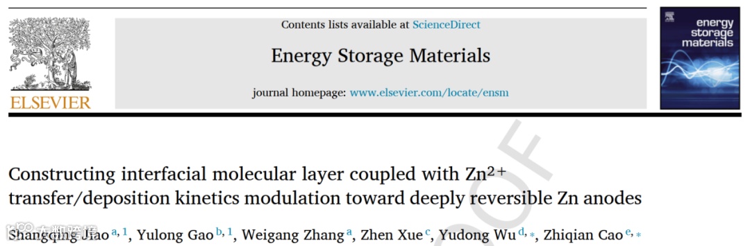 近日,滁州学院焦尚青博士,淮北师范大学曹志钱博士和安徽理工大学吴玉东博士合作,在国际知名期刊Energy Storage Materials上发表题为“Constructing interfacial molecular layer coupled with Zn2+ transfer/deposition kinetics modulation toward deeply reversible Zn anodes”的研究性文章。在该研究中提出了一种创新的界面策略,即利用生物大分子支链淀粉糖(Pul)在电解液系统中激活锌金属阳极(ZMAs)表面。实验结果与理论模拟计算相结合表明,在添加剂Pul分子的自适应吸附作用下,界面分子层(IML)的自发组装不仅在电极界面触发了富Zn2+区域的形成,有效平衡了离子通量,同时将Zn2+的成核生长模式转变为瞬时渐进的杂化机制。重新配置Zn2+在非均质电极/电解质界面的转移/沉积动力学。此外,在固/液界面处,IML对高热力学活性的水合氢和SO42-具有稳定的屏蔽作用。因此,在随后的电镀过程中,实现了深度可逆的锌沉积。