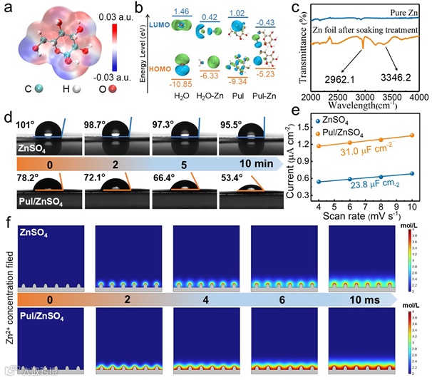 一般来说,在纯ZnSO4 电解液内,锌金属表面吸附大量的自由水和SO42-离子,以减少总的表面自由能。因此,严重的界面副反应是由于电极表面存在着丰富的自由水和不可忽略的SO42-离子。在含有Pul添加剂的混合电解质中,长链Pul分子具有丰富的侧向分布的极性末端,通过静电相互作用在ZMAs表面形成适应性排列,从而直接影响ZMAs表面Zn2+离子的分布以及后续的电沉积/剥离。
