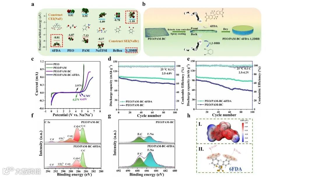 图3. (a) 6FDA、PEO、PAM、NaTFSI、BrBen和1,2-DBB添加剂的LUMO/HOMO值的理论计算及相应的几何结构图;(b) 机械臂控制喷涂6FDA和1,2-DBB分子在PEO/PAM-BC膜两侧的示意图;(c) PEO、PEO/PAM、PEO/PAM-BC和PEO/PAM-BC-6FDA CPEs的LSV曲线;(d) 在2.5-4.0 V电压范围内,NVP||PEO/PAM-BC||Na和NVP||PEO/PAM-BC-6FDA||Na电池的循环性能;(e) 在2.5-4.2 V电压范围内,NVP||PEO/PAM-BC||Na和NVP||PEO/PAM-BC-6FDA||Na电池的循环性能;(f, g) 在2.5-4.2 V电压范围内,PEO/PAM-BC和PEO/PAM-BC-6FDA CPEs经过100个循环后,NVP阴极的C 1s和F 1s XPS图谱;(h) 6FDA的ESP分布以及V3+/4+与6FDA分子的螯合机制。