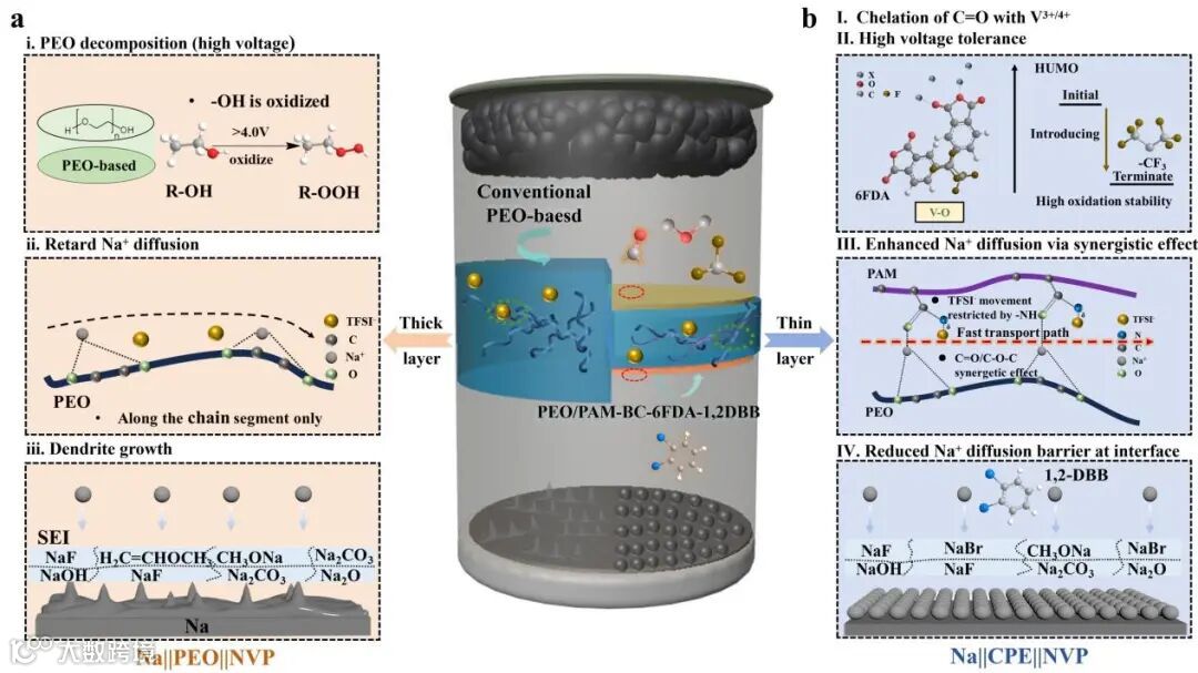 图1. PEO/PAM-BC-6FDA-1,2-DBB 复合固态电解质在多尺度上的设计示意图。(a) Na||PEO||NVP原型存在的问题,包括:ⅰ 高电压下PEO分解;ⅱ Na+沿EO链缓慢的传输;ⅲ 不稳定的SEI层和枝晶生长。(b) Na||CPE||NVP原型的多尺度改进,包括:Ⅰ 抑制的TM串扰效应;Ⅱ 提高高电压耐受性;Ⅲ Na+传输的协调效应;Ⅳ 降低的Na+扩散势垒和均匀的Na沉积。