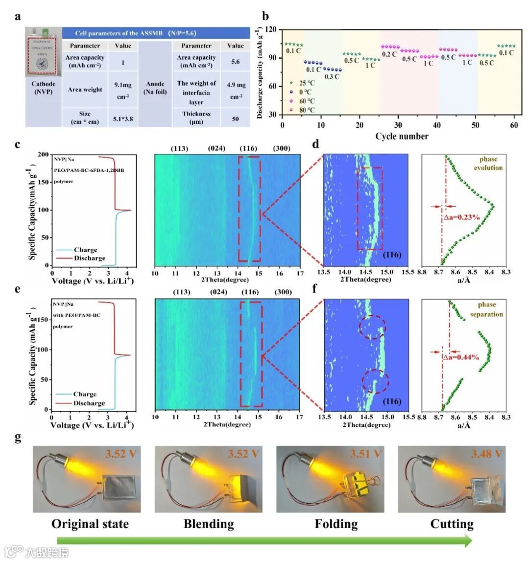 图5. (a) NVP||PEO/PAM-BC-6FDA-1,2-DBB||Na软包电池模型的技术规格,插图为软包电池的照片;(b) 在2.5-4.2V电压范围内,NVP||PEO/PAM-BC-6FDA-1,2-DBB||Na软包电池在0-80℃宽温度范围内的循环性能;(c, e) 在初始循环期间,NVP||PEO/PAM-BC-6FDA-1,2-DBB||Na和NVP||PEO/PAM-BC||Na的电压曲线和原位XRD的等高线图;(d, f) NVP正极(116)衍射峰的等高线图和晶格参数a轴的相应变化;(g) 在弯曲、折叠和切割情况下,充电后的NVP||PEO/PAM-BC-6FDA-1,2-DBB||Na软包电池点亮灯泡的情况。