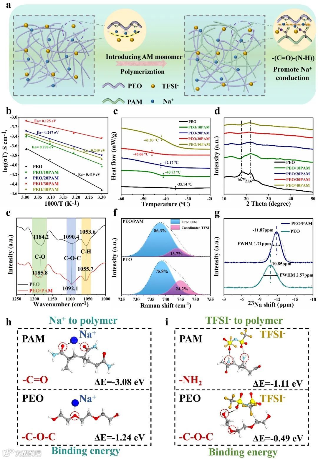 图2. (a) PEO/PAM基质中聚合的AM单体的示意图;(b) 不同PAM比例的PEO/PAM SPEs的离子电导率;(c) 不同PAM比例的PEO和SPEs的DSC曲线;(d) 不同PAM比例的PEO基SPEs的XRD图谱;(e) 初始PEO和PEO/PAM膜在1250-1000 cm⁻¹处的FTIR图谱;(f) 初始PEO和PEO/PAM膜在725-755 cm⁻¹处的拉曼光谱图;(g) PEO和PEO/PAM膜中Na+化学环境的23Na ssNMR谱图;(h) Na+与PAM和PEO链的结合能及相应的吸附构型;(i) TFSI⁻阴离子与PAM和PEO链的结合能及相应的吸附构型。