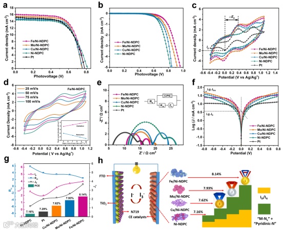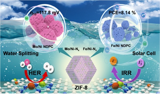 通过DFT计算发现,具有零带隙特性且在费米能级处具有高电子密度的双金属氮单原子活性位点(M/Ni–Nx)能够提高催化剂的催化活性。在IRR中,Fe/Ni–Nx催化剂通过延长I₁–I₂键长,有效促进了I₃⁻复合物的解离;而Mo/Ni–Nx催化剂则因其较低的氢吸附自由能,显著加速了电催化的HER动力学过程。基于上述理论指导,研究团队将三种双金属氮单原子活性位点(M/Ni–Nx,其中M为Fe、Cu和Mo)精准构筑于沸石咪唑框架衍生的氮掺杂多孔碳(M/Ni–NDPC)中。实验结果表明,Fe/Ni–NDPC单原子在IRR中表现出优异的催化性能,组装的太阳电池获得了8.14%效率;而Mo/Ni–NDPC在HER中展现出卓越的电催化活性,过电位低至117.8 mV。
