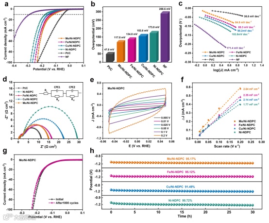 图5. HER电催化性能:(a)LSV极化曲线,(b)10 mV电流密度下的过电位柱状图,(c)塔菲尔斜率值,(d)奈奎斯特图;(e)不同扫描速率下Mo/Ni–NDPC的CV曲线;(f)双电层电容值;(g)1000次CV循环前后的LSV曲线;(h)CP曲线。