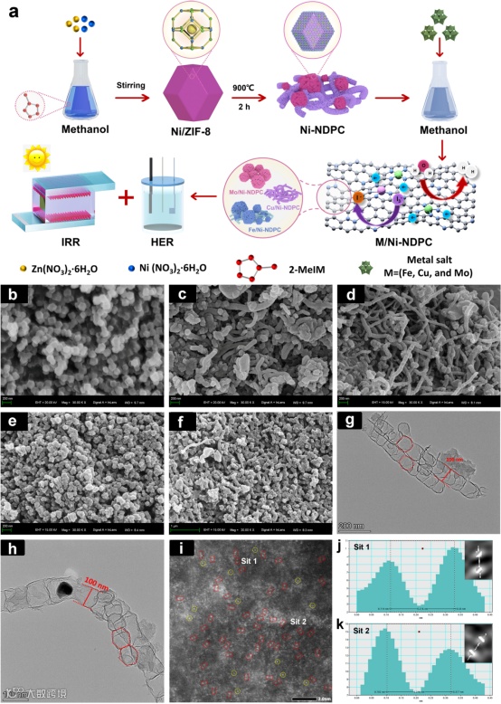 图2.(a)M/Ni–NDPC电催化剂制备示意图。(b)Ni/ZIF-8、(c)Ni–NDPC、(d)Cu/Ni–NDPC、(e)Mo/Ni–NDPC和(f)Fe/Ni–NDPC的FESEM图像。(g)Mo/Ni–NDPC和(h)Fe/Ni–NDPC的TEM图像。(i)Fe/Ni–NDPC的像差校正HAADF-STEM 图。(j和k)图i中标注的位点1和位点2的线扫描强度谱。