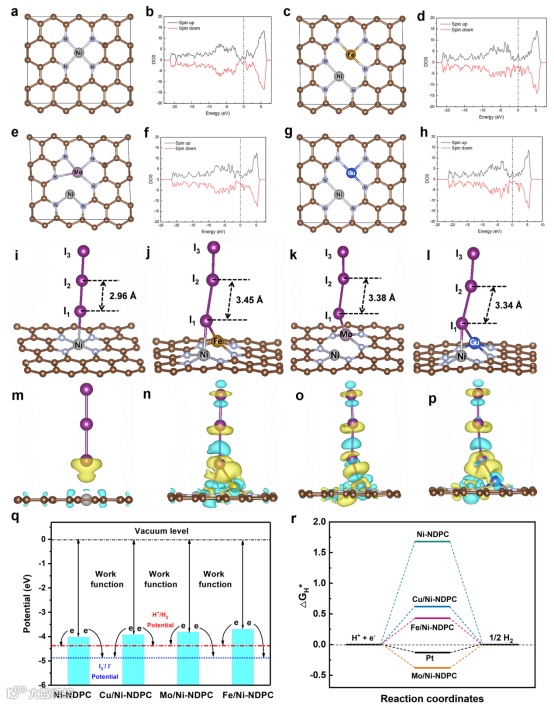 通过密度泛函理论(DFT)计算,系统研究了不同金属氮单原子位点的催化活性。结果表明,M/Ni-NDPC催化剂不仅具有零带隙特性,还在费米能级处表现出较高的电子密度,这显著地提升了其在IRR和HER中的电子传输效率。在IRR中,Fe/Ni-NDPC催化剂的I₁–I₂键长(3.45 Å)明显长于Mo/Ni-NDPC(3.38 Å)、Cu/Ni-NDPC(3.34 Å)和Ni-NDPC(2.96 Å),这种结构特性有利于I₃⁻复合物的解离。进一步分析表明,M/Ni-NDPC催化剂具有匹配的功函数值,能够有效促进IRR和HER过程中的电子转移。此外,Mo/Ni-NDPC表现出最低的氢吸附自由能(ΔGH* = 0.38 eV),显著优于Fe/Ni-NDPC(0.43 eV)、Cu/Ni-NDPC(0.62 eV)和Ni-NDPC(1.68 eV),从而在HER反应中展现出更优异的催化活性。