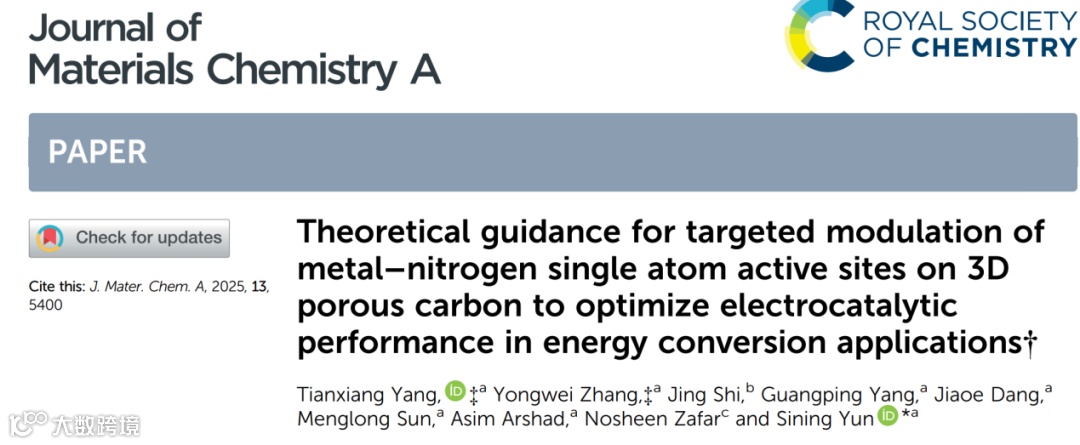 Tianxiang Yang‡, Yongwei Zhang‡, Jing Shi, Guangping Yang, Jiaoe Dang, Menglong Sun, Asim Arshad, Nosheen Zafar, Sining Yun*. Theoretical guidance for targeted modulation of metal–nitrogen single atom active sites on 3D porous carbon to optimize electrocatalytic performance in energy conversion applications. Journal of Materials Chemistry A, 2025,13, 5400-5414.