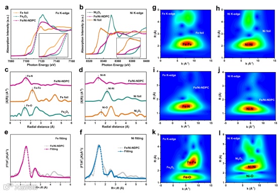 图3(a和b)Fe/Ni–NDPC和参考样品在Fe K-edge和Ni K-edge的XANES光谱;(c和d)Fe/Ni–NDPC及其参考样品在Fe K-edge和Ni K-edge的EXAFS光谱的傅里叶变换;(e和f)Fe/Ni–NDPC在Fe K-edge和Ni K-edge的EXAFS光谱拟合曲线的傅里叶变换;(g–l)Fe/Ni–NDPC和参照样品在Fe K-edge和Ni K-edge的k²加权下的小波变换。