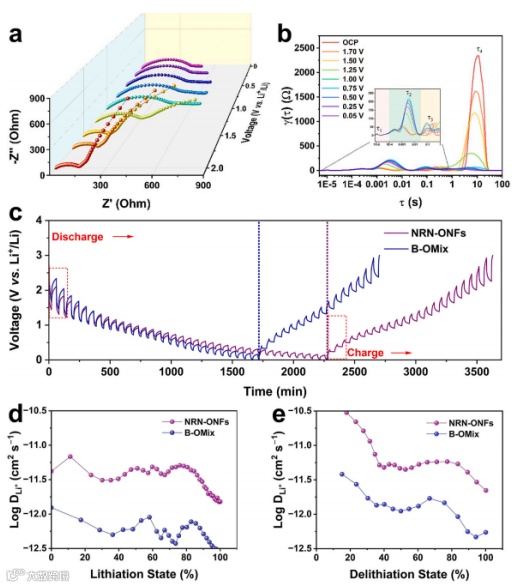 通过原位电化学阻抗谱(EIS)和弛豫时间分布(DRT)分析,揭示了NRN-ONFs在循环中能形成稳定的固体电解质界面(SEI)膜。恒电流间歇滴定技术(GITT)表明NRN-ONFs良好的锂离子扩散能力(DLi⁺),可为优异倍率性能下的电极反应动力学提供保障。将NRN-ONFs直接作为自支撑电极仍能保持优异的电化学性能,为可穿戴设备轻量化、高能量密度的电极材料提供潜在的解决方案。
