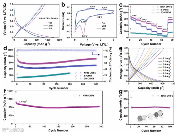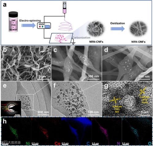 通过扫描电镜和透射电镜表征,表明NRN-ONFs纤维电极具有一维和二维结构相互连接的形态,其中活性金属氧化物均匀的分布在二维结构中。通过在维持原一维纤维穿插的三维网状骨架上引入二维单元,创造性的将反应中心和导电通路分开,有效提高电极材料在电化学储锂中的电子/离子传输效率和体积应变能力,有利于提升LIBs在充放电过程中的倍率能力和循环稳定性。