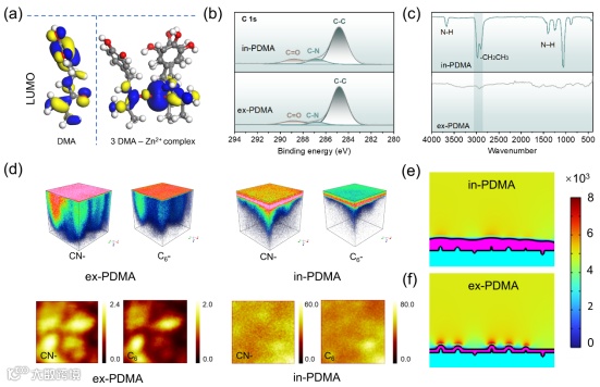 制备浓度分别为0.1、0.5和1.0 mg mL−1的DMA溶液测试新电解质的离子电导率。电解质阻抗随浓度增加而增加,离子电导率随浓度升高而降低 (图4d)。在对称电池的循环测试中,通过分析10 mV极化前后Zn||Zn对称电池的阻抗谱,计算出Zn2+的迁移。结果表明,虽然离子电导率略有下降,但Zn2+的迁移数明显增加。重要的是,离子电导率的降低不会对电池的循环稳定性产生不利影响。in-PDMA的扩散活化能(Ea)为34.5 kJ mol−1(图4e),明显低于ex-PDMA的扩散活化能(44.56 kJ mol−1)和Bare Zn的扩散活化能(55.66 kJ mol−1)。Ea的降低是由于SEI和Zn离子之间的强结合能降低了阳极界面处的脱溶能垒,以及DMA和水分子形成的氢键网络抑制了水的运动,同时促进了Zn离子的迁移。