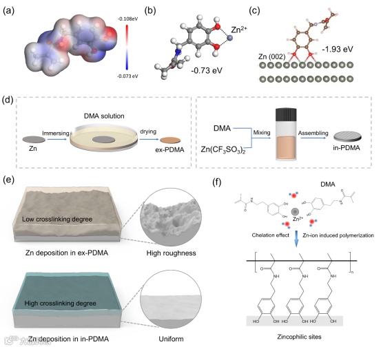 为此,中国矿业大学(北京)的刘瑞平教授、新加波南洋理工大学杨金霖研究员合作,在国际知名期刊Advanced Energy Materials上发表题为“Chelation effect induced robust biomass protective layer for aqueous Zn metal anode”的研究文章。该研究文章提出了在锌负极上原位构建聚合物SEI的新方法。通过在电解液中加入N-[2-(3,4-dihydroxyphenyl)ethyl]-2-methylacrylamide (DMA)添加剂,利用 Zn2+的螯合效应增加聚合物的交联度提升SEI层的致密性,提高了镀锌的稳定性,抑制的锌枝晶的生长,并改善了负极电解质界面。同时由于优化了表面的电荷分布,减少了碱性副产物以及析氢反应,从而提高电池的整体循环稳定性。