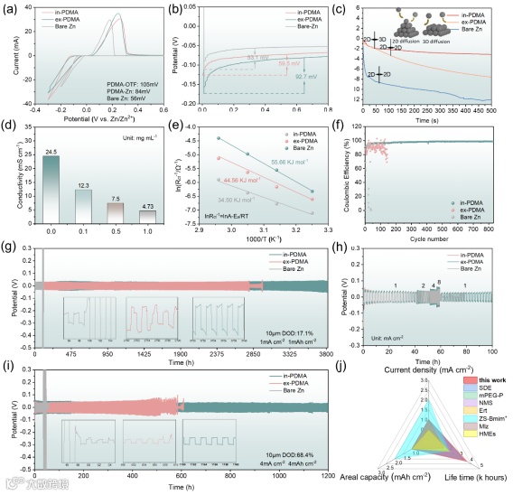 在库仑效率(CE)方面的差异,in-PDMA的CE保持稳定超过800次循环,而ex-PDMA持续约100次循环,而Bare Zn则少于50次循环(图4f)。这些结果表明,in-PDMA显著提高了沉积-剥离动力学。对称电池的长期循环性能如图3g所示,其中in-PDMA在1ma cm−2下实现稳定循环,放电深度(DOD)为17.1%,持续时间超过3800小时,ex-PDMA稳定循环超过2800小时,而Bare Zn仅工作100小时。在更高的电流密度和更大的DOD条件下(图4i),in-PDMA进一步表现出令人印象深刻的性能。在DOD为68.4%的情况下, ex-PDMA稳定工作了600小时,而in-PDMA在其致密的SEI层的帮助下将循环寿命延长至1200小时,而Bare Zn在100小时内失。这些系统的对称电池测试清楚地证明了In-PDMA对阳极性能的直接优化效果。