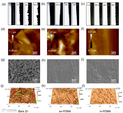 In-PDMA构建SEI层显著的提升了镀锌的均匀性和稳定性,从而减少锌枝晶生长。并且均匀覆盖的SEI层使负极表面的电荷更加均匀,诱导锌离子均匀沉积。原子力显微镜(AFM)和扫描电镜(SEM)分析表明,裸锌表面存在明显的枝晶结构,其表面粗糙度接近2 μm。在in-PDM中,SEI层减少了枝晶的形成,表面波动仅为0.4 μm。在原位体式显微镜,AFM,SEM,以及CLSM的测试观测中,in-PDMA均具有良好的表现,这充分的证实了in-PDMA的优异性能。