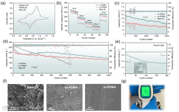 采用NaV3O8·1.5H2O (NVO)作为正极,对不同阳极进行全电池测试。在0.1 mV s−1的扫描速率下,三个NVO全细胞的循环伏安曲线高度一致,没有观察到新的氧化还原峰。这表明阳极的插入行为没有被优化过程改变(图5a)。随后,在各种操作条件下进行了一系列长期循环试验。在不同电流密度下测试后(图5b),很明显,与ex-PDMA和Bare Zn全电池相比,in-PDMA表现出优越的循环稳定性,保持更高的容量。在长期循环中,in-PDMA始终优于其他两种负极。同样,在速率循环测试中,in-PDMA负极相对于其他阳极表现出更优异的库仑效率性能。在5A g−1下(图5c), 2000次循环后,in-PDMA的比容量保持在75 mAh g−1左右,显著高于ex-PDMA和Bare Zn。在1 A g−1下循环1000次后(图5d), in-PDMA的比容量保持在150 mAh g−1以上,平均库仑效率为99.84%。相比之下,Bare Zn和ex-PDMA电极的平均库仑效率分别为98.10%和99.20%。图5e展示了in-PDMA的袋状电池,说明了该优化方法在各种工况下的可行性。对电池完全循环后的负极进行扫描电镜分析发现Bare Zn表面存在大量的树突,这是导致容量和库仑效率不稳定的主要因素(图5f)。在实际中,充满电的全电池可以成功的点亮电子温度计(图5g)。