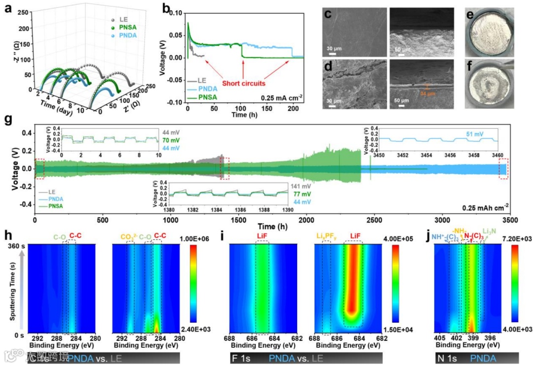 图3 a)PNDA锂对称电池在不同时间下的电化学阻抗谱。b)PNDA锂对称电池在单侧剥落过程中的电压分布。c-f)单侧剥落测试后锂电极的扫描电镜图像和光学图像。g)PNDA锂对称电池的剥落沉积测试。h-j)循环后锂电极 C 1s,F 1s和N 1s的深度XPS光谱。
