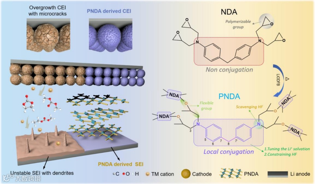 PNDA能够在锂电极表面形成均匀的富含LiF/N-(C)3/Li3N无机相的SEI膜,减少了溶剂分子的分解并促进锂离子致密且均匀的剥落/沉积,对锂金属负极具有良好的界面相容性。