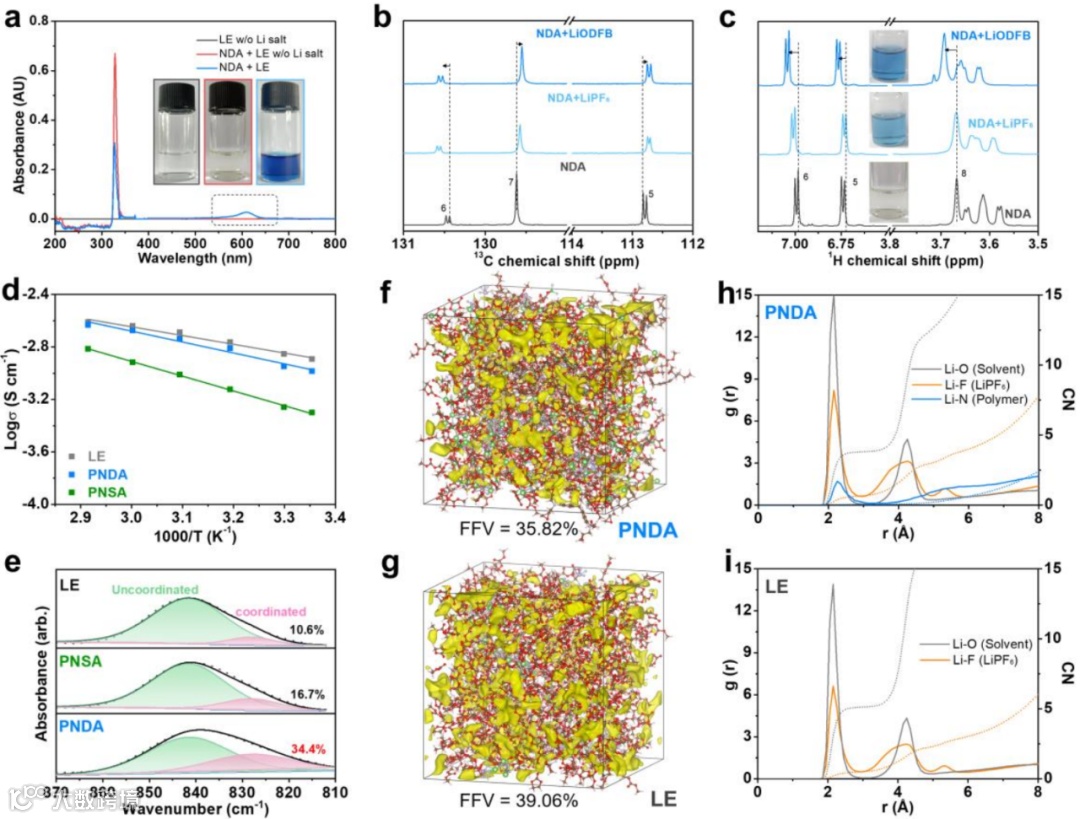 图2 PNDA的化学分析及理论计算。a)紫外可见光谱分析。b-c)加入锂盐前后NDA的13C、1H核磁变化。d)PNDA离子电导率随温度的变化曲线。e)PF6–配位的红外光谱分析。f-g)PNDA与酯基电解液(LE)的MD分析。