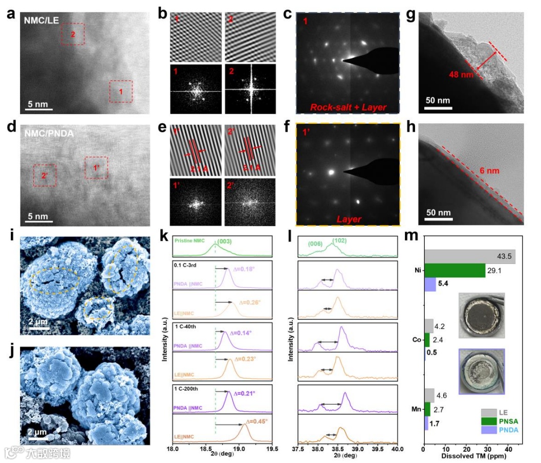 图6 循环后的NMC正极的结构表征。a-h)HRTEM、FFT表征。i-h)SEM表征。k-l)不同循环次数下的XRD表征。m)循环后锂片的ICP-MS表征。