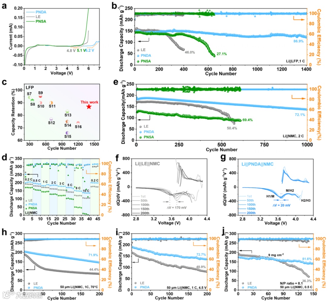 图4 a)PNDA电解质的LSV曲线。b)Li/PNDA/LFP电池的循环性能。c)全电池循环寿命和容量保持率对比。(d) Li/PNDA/NMC电池的倍率性能。(e) Li/PNDA/NMC电池的循环性能。f-g)LE-和PNDA-的Li//NMC电池在不同充放电过程中的dQ/dV曲线。h-j)薄Li/PNDA/NMC电池分别在70℃,4.5 V截止电压,和高NMC负载下的循环性能。