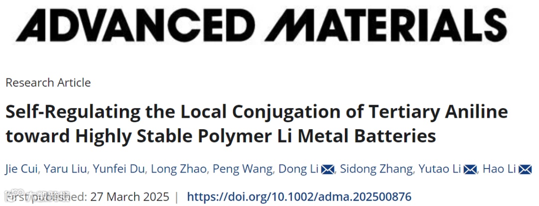 Jie Cui#, Yaru, Liu#, Yunfei Du#, Long Zhao, Peng Wang, Dong Li*, Sidong Zhang, Yutao Li*, Hao Li*, Self-Regulating the Local Conjugation of Tertiary Aniline toward Highly Stable Polymer Li Metal Batteries, Advanced Materials 2025.
