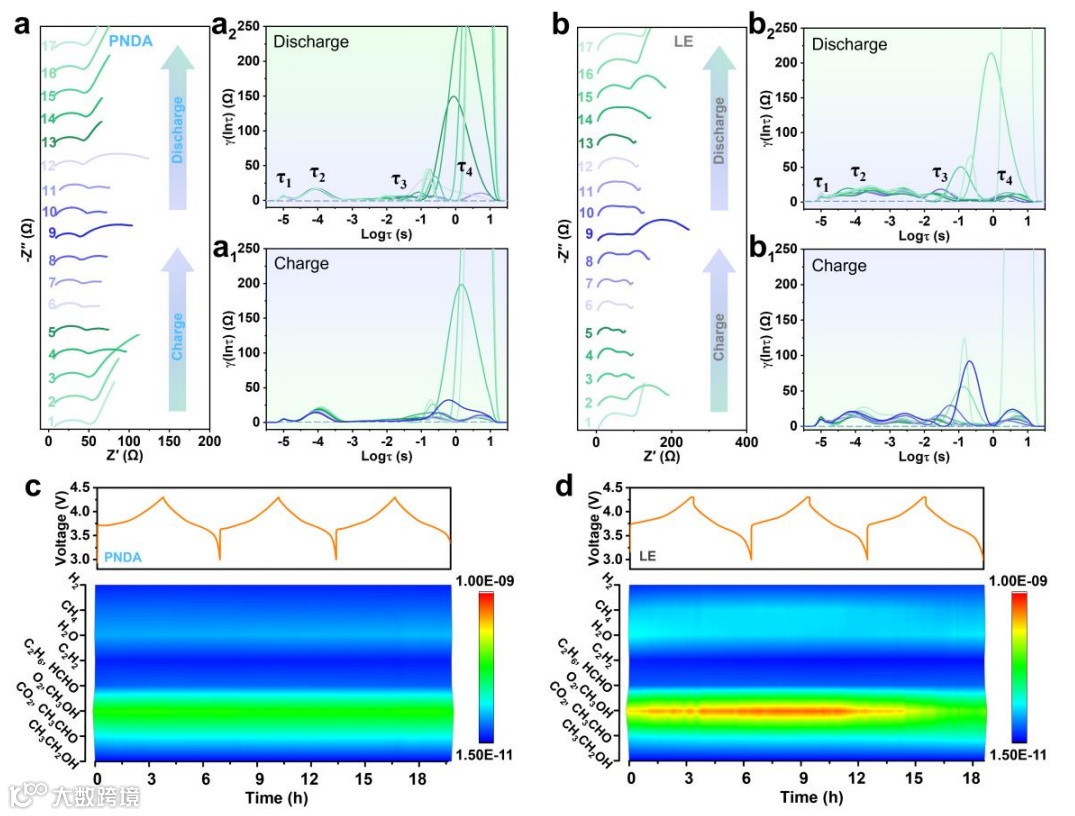 图5 Li/PNDA/NMC电池的原位电化学阻抗谱和原位差分电化学质谱分析。