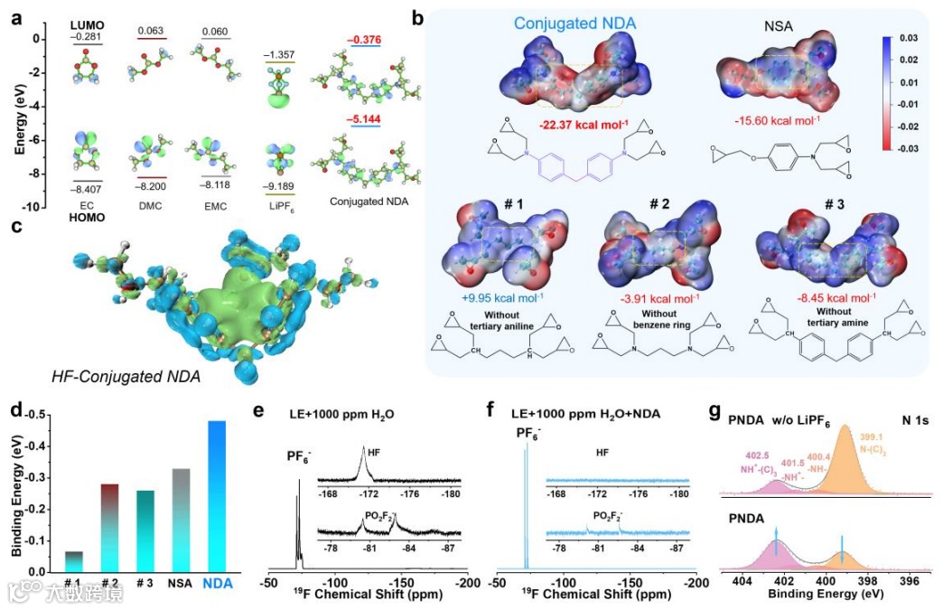 图7 PNDA清除HF的作用机理。a)不同组分前线轨道能级对比。b)局部共轭后的NDA的静电势计算。c)局部共轭后的NDA与HF作用后的差分电荷密度图。d)局部共轭后的NDA与HF间的结合能计算。e-f)加入水后LE和NDA+LE的19F核磁分析。g)加入锂盐前后PNDA中N元素的价态变化分析。
