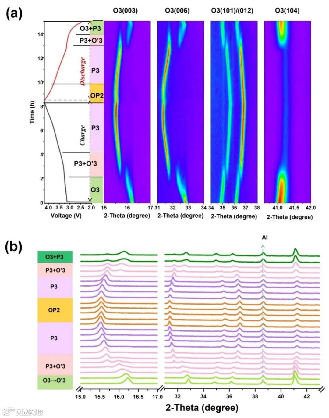 图6:(a)原位XRD测试首周充放电曲线及原位XRD图二维等高线图。(b)原位XRD图的瀑布图。