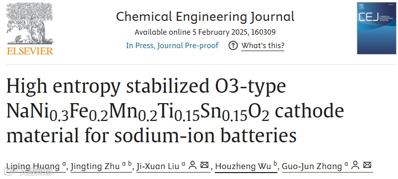 近日,东华大学张国军研究员、刘吉轩研究员和赛迈科先进材料股份有限公司吴厚政博士合作团队在国际知名期刊《Chemical Engineering Journal》上发表了题为“High Entropy Stabilized O3-type NaNi0.3Fe0.2Mn0.2Ti0.15Sn0.15O2Cathode Material for Sodium-Ion Batteries”的研究论文,为钠离子电池正极材料的设计与开发提供了全新思路。该研究创新性地提出了“定制化高熵设计”理念,将高熵材料的构成元素划分为功能调节元素(Function-Regulation Element, FRE)和结构稳定元素(Structure-Stabilization Element, SSE),并基于化学反应性、电化学性能、成本效益、环境友好性和长期稳定性等多维度考量,筛选出Ni、Fe、Mn、Ti和Sn五种关键元素,成功构建了一系列高熵氧化物正极材料Na[Ni0.3Fe0.2Mn0.2Ti0.3-xSnx]O2,深入研究了结构组分比例变化对正极材料稳定性的影响规律,并揭示了其与构型熵之间的内在关联。实验结果不仅实现了材料性能的优化提升,更将可持续发展理念融入材料设计全过程,为高熵材料在能量存储与转换、环境保护和先进制造等领域的广泛应用提供了新的思路。
