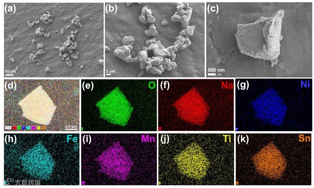 图3:NFMTSeq在不同放大倍数下的扫描电子显微镜(SEM)图像(a-c);以及元素分布图结果(d-k)。