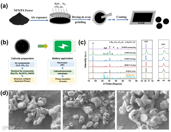 图8:空气环境中NFMTSeq的结构转换。(a)空气暴露实验示意图。(b)从外部到内部暴露在潮湿空气中的层状氧化物所面临的挑战示意图。(c-d)TS、TS-Air和TS-Re的XRD和SEM图谱。