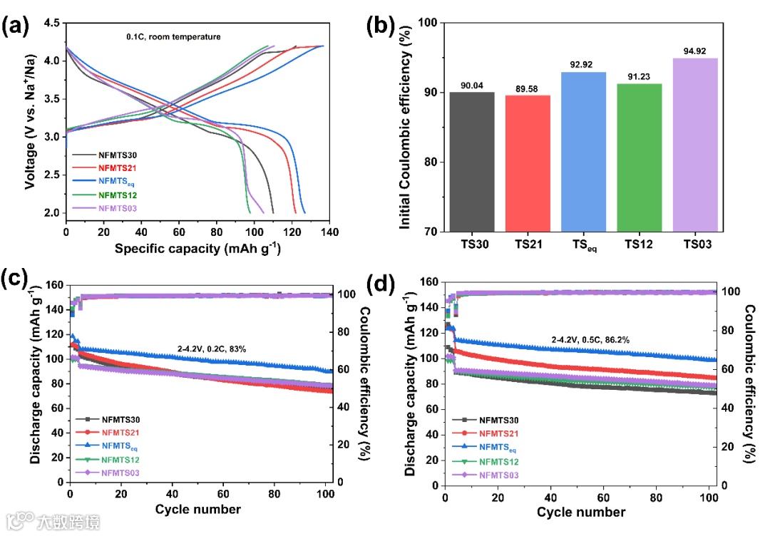 图2a为在0.1C电流密度下,2.0至4.2 V电压窗口内,所有电池材料的初始容量-电压曲线。结果显示NFMTS30、NFMTS21、NFMTSeq、NFMTS12和NFMTS03的初始充电比容量分别为122.2、136.2、136.6、107.2和110.6 mAhg-1,首周库仑效率值分别为90.0%、89.6%、92.9%、91.2%和94.9%(图2b)。其中,NFMTSeq样品表现出最佳的循环稳定性,在0.2C和0.5C下循环100次后,容量保留率分别约为83%和86.2%(图2c-d)。这表明当Ti和Sn元素含量趋于相等时,体系的熵值较高,有利于单相固溶体的形成,从而提高材料的整体稳定性和电化学性能。鉴于此,在后续研究工作中深入探索O3-NFMTSeq材料的结构与电化学性能之间的内在关系将具有重要意义。