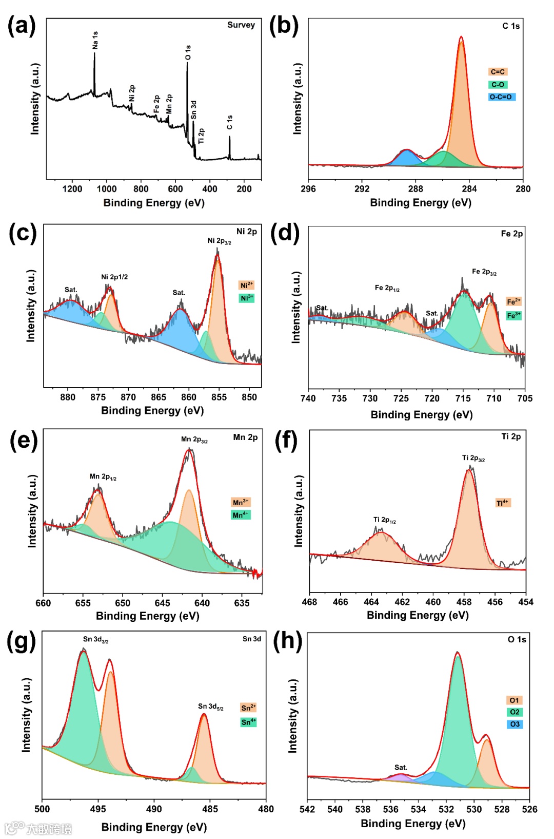 图5:O3-NaNFMTSeq的高分辨率X射线光电子能谱(XPS)谱图。(a)全谱,(b)C 1s,(c)Ni 2p,(d)Fe 2p,(e)Mn 2p,(f)Ti 2p,(g)Sn 3d,(h)O 1s。