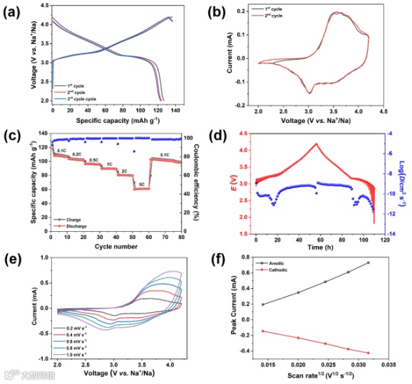 图4:O3-NaNFMTSeq正极材料在2.0-4.2V电压范围内的(a)充放电曲线,(b)循环伏安(CV)曲线,(c)倍率性能,(d)恒电位间歇滴定技术(GITT)测试曲线及计算的钠离子表观扩散系数,(e)不同扫描速率下的CV曲线,(f)不同扫描速率下峰电流(ip)与扫描速率平方根(v1/2)的拟合曲线。