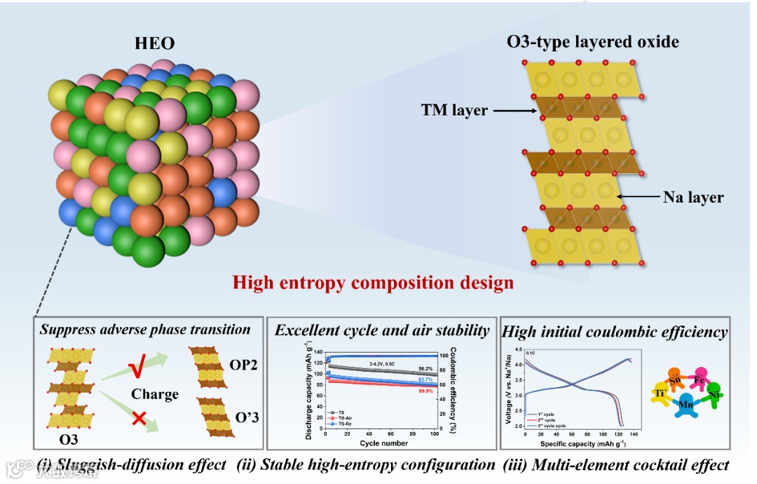 随着全球对可持续能源需求的不断增长,钠离子电池凭借其资源丰富、成本低廉、低温性能优异以及环境友好等显著优势,正迅速崛起为下一代储能技术的有力竞争者。在众多钠离子电池正极材料中,O3型过渡金属层状氧化物因其高理论比容量、简易的合成工艺以及丰富的资源储备而备受瞩目。然而,O3型正极材料在实际应用中仍面临两大关键挑战:(1)结构稳定性问题:在反复的钠离子脱嵌过程中,O3型正极材料容易发生不可逆的相变和结构退化,导致容量衰减和循环性能下降。(2)空气稳定性问题:长时间暴露于空气中时,O3型正极材料会与水分、二氧化碳和氧气发生反应,导致钠含量降低和容量不可逆损失。此外,材料表面生成的碱性物质会在电极浆料制备过程中引发凝胶化,增加涂覆难度,并可能导致电池内阻增大和产气增多,最终影响电池性能。为了克服这些挑战,研究人员积极探索了多种改性策略,包括离子掺杂、结构设计、表面涂层和工艺优化等。近年来,高熵氧化物(HEOs)作为一种新兴材料,凭借其独特的高熵效应、迟滞扩散效应、晶格畸变效应和“鸡尾酒”效应,为O3型层状氧化物正极材料的改性提供了新的思路。高熵氧化物是由四种及以上元素以等摩尔比或近等摩尔比组成,并形成单相、结构稳定的固溶体材料。通过精确调控元素种类和比例,高熵氧化物能够显著提升正极材料的结构稳定性和电化学性能。值得注意的是,高熵设计的成功与否很大程度上取决于元素的选择,特别是在钠离子电池正极材料的开发中。元素的选择不仅影响材料的基本性能,如结构稳定性、电导率和离子迁移率,还决定了材料在实际应用中的可行性和长期可靠性。因此,在设计用于钠离子电池的高熵正极材料时,必须精心调控元素组合,以满足电池的具体要求。