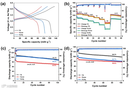 图9:TS、TS-Air和TS-Re在0.2C和0.5C下的初始充放电曲线、倍率性能和长期循环寿命比较。