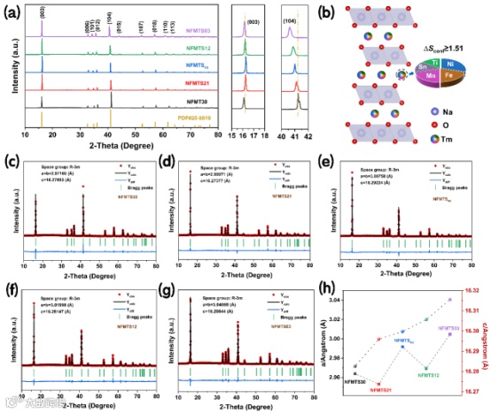 图1:合成的高熵粉末的表征。(a)X射线衍射(XRD)图案及放大图像。(b)晶体结构示意图。NFMTS03、NFMTS21、NFMTSeq、NFMTS12和NFMTS03的XRD精修结果分别为(c)、(d)、(e)、(f)和(g)。(h)不同成分比例下,从XRD精修得到的晶格参数a和c的变化。