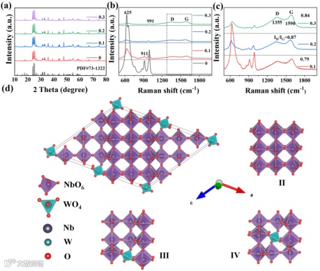图2 晶体结构与成分分析:(a) WNb12O33和WNb12O33@N-C的XRD图谱和(b , c)拉曼光谱,(d) 0.2 WNb12O33的晶体结构和WNb12O33中存在的三个离子隧道。