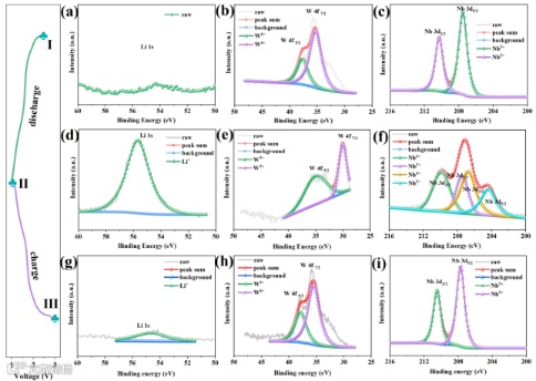 XRD谱图和晶体结构证明材料具有3×4×∞ ReO₃剪切结构,沿ac轴排列的ReO₃型NbO₆八面体块与WO₃四面体通过边共享(NbO₆)及边角共享(WO₃)连接,形成高度稳定的三维框架。沿b平面延伸的七条平行隧道(包括Ⅱ、Ⅲ、Ⅳ型离子通道),为锂离子提供三维开放传输路径,结合高比表面积(7.333 m²/g),显著提升锂离子存储容量与动力学性能。氮掺杂碳包覆未改变WNb₁₂O₃₃的本体晶体结构,但通过碳层修饰优化了表面特性,结合剪切结构的三维离子通道,协同实现了材料的高结构稳定性与高效锂离子传输能力。