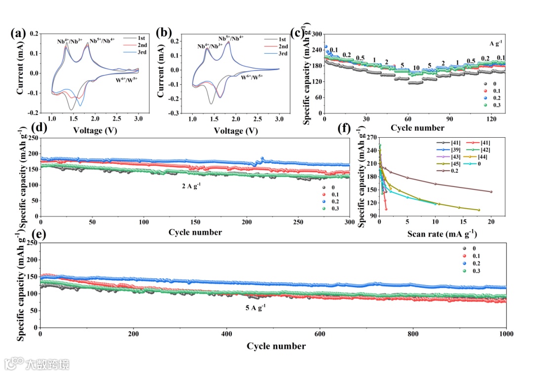 图4 电化学性能:(a) WNb12O33和(b) 0.2WNb12O33@N-C的CV曲线,(c)所有样品在2 A g-1和5 A g-1下的倍率性能和(d, e)长期循环性能,(f)已报道的铌基材料与本工作的倍率性能对比。