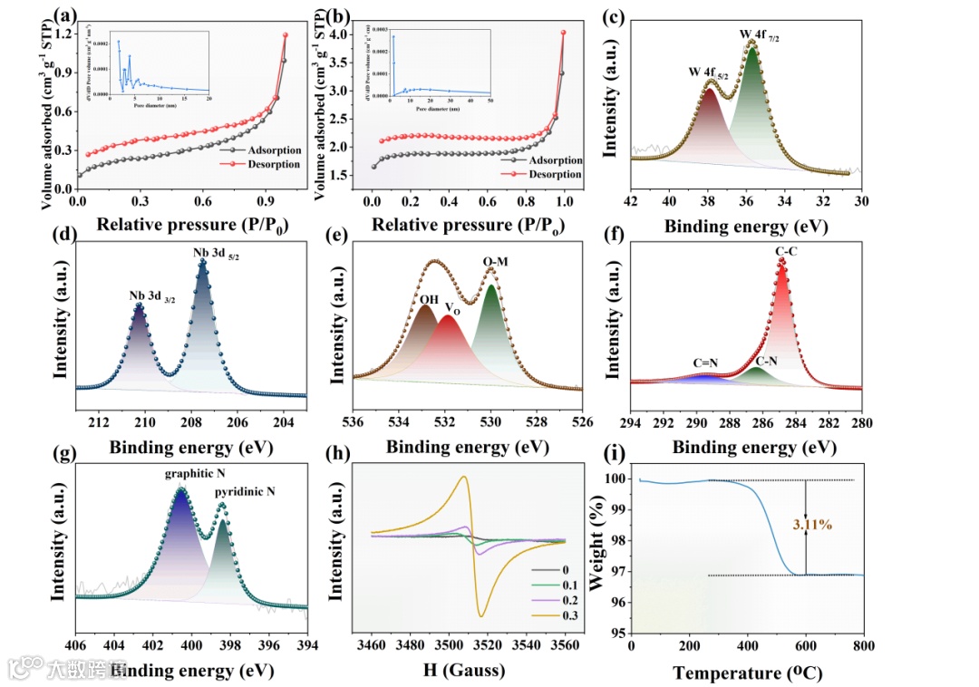 图3 表面性质与缺陷表征:WNb12O33和0.2WNb12O33@N-C的(a , b) N2吸附-脱附和BJH孔径分布曲线,0.2 WNb12O33@N-C的XPS谱(c) W 4f,(d) Nb 3d,(e) O 1s;(f) C1S;(g) N 1s,(h) WNb12O33和WNb12O33@N - C的EPR谱,(i) 0.2 WNb12O33@ N - C的热重分析。