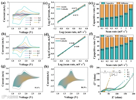 图5 动力学机制:WNb12O33和0.2WNb12O33@N-C在0.1~5 mV s-1的(a, b) CV曲线、(c、d) log i vs. log v关系、(e, f)赝电容贡献、(g, h)在5 mV s-1的电容行为,(i)样品的EIS曲线。